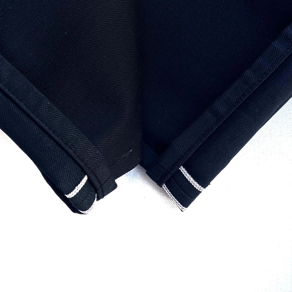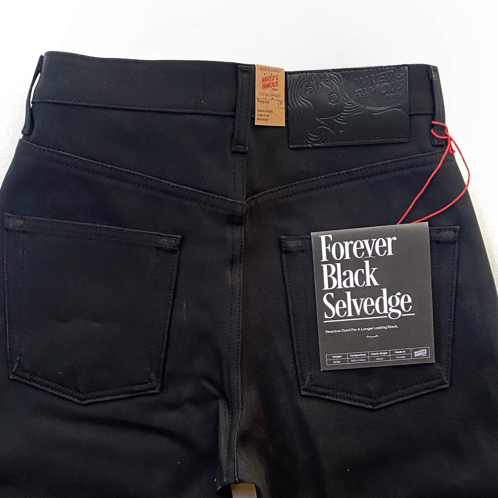 Those looking for a long-lasting black color denim, look no further!  The Forever Black Selvedge from Naked & Famous Denim is a 12.5oz Japanese Selvedge denim dyed with a permanent reactive dye to enhance a forever long-lasting dark black color.  As opposed to traditional raw denim, where just the exterior warp yarn is dyed, the yarns in the Forever Black Selvedge are dyed through to the core. This process ensures that even with extensive wear, fading is minimized, perfect for those looking for sleek black denim. Crafted from 100% cotton, this denim delivers a classic rigid raw denim feel.